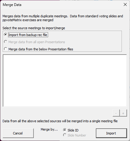 Go back to your PowerPoint and go to Add-ins > CLiKAPAD > Voting Results > Import / Merge Data. On the Window that opens choose Import from backup rec file and then click Import.