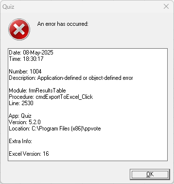Voting runs as expected and the results preview shows data but when you export to Excel you get this error at the point of confirming the file name for the Excel.