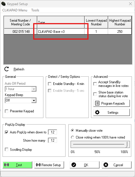 Go to Add-ins > CLiKAPAD > Set up > Keypads. Your receiver should be showing on this screen and the background of the cell that says CLiKAPAD Base v3 should be white. If the background of the cell is red, the software cannot detect your receiver. Try a diffferent USB port and then click the Refresh button. If that doesn't work, try a different USB port.