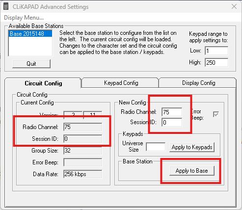 Check the Radio Channel in the box on the right in the Current Config session. If that is NOT 75, type 75 and session 0 into the New Config section and then click Apply to Base.